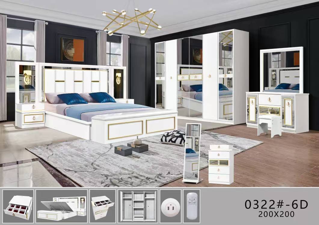غرفة نوم متكاملة تضيف لمسة من الأناقة والرقي إلى منزلك. تتكون من سرير مريح، دولاب واسع، 2 كومود جانبي، وحدة أدراج متعددة الاستخدامات، تسريحة أنيقة، ومرايا تضفي عمقًا وإشراقة للمساحة. تصميم مثالي يجمع بين الجمال والعملية، مما يجعلها إضافة رائعة.